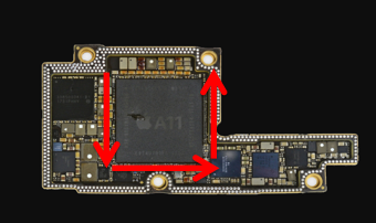 底部填充膠因毛細管虹吸作用按箭頭方向自動填充。通常情況下常用“一”型和“L”型,和“U”型作業(yè),通過表面觀察,可以看到會形成底部填充初步效果。