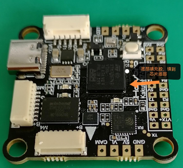 無人機控制板PCB板上有兩個BGA芯片模塊需要底部填充膠點膠加固保護,抗震動,適應冷熱環(huán)境沖擊,提高產(chǎn)品的可靠性。